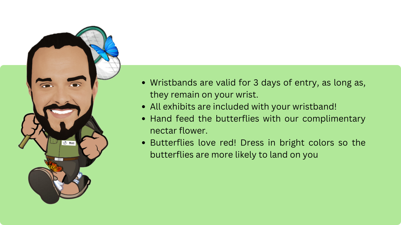 Your self-guided experience takes you on an adventure through the rainforest to explore over 1,000 live exotic butterflies imported from their native countries. Guests can feed the butterflies with a complimentary nectar flower! Watch the 3-D Flight of the Butterflies Movie (15 Minute Duration) to learn more about the Monarch Migration. Immerse yourself in the forest floor of the rainforest and walk through the Mirror Maze.